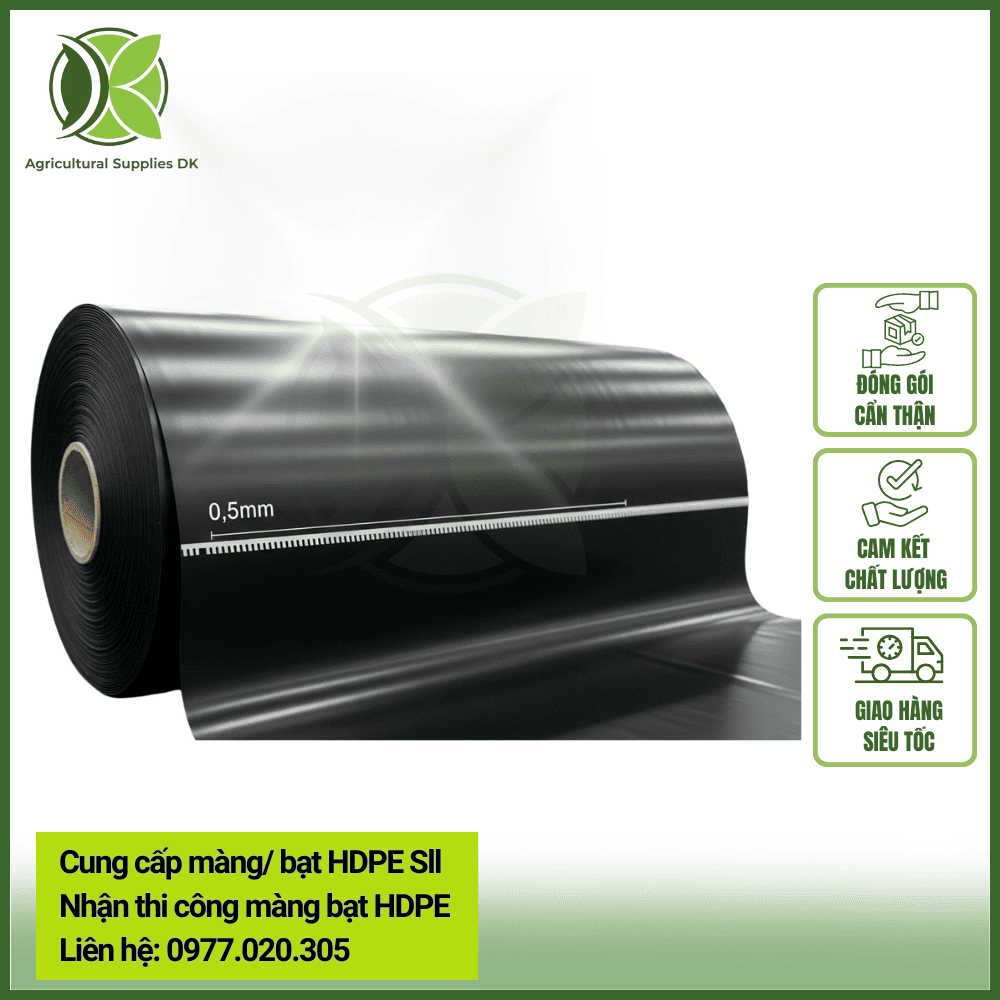 Màng chống thấm HDPE 0.5mm (hay bạt HDPE 500 micron) được sản xuất từ các hạt nhựa cao phân tử Polyethylene tỷ trọng cao kết hợp với hàm lượng nhỏ carbon đen. Đây là độ dày tiêu chuẩn được các chuyên gia khuyên dùng cho các ao nuôi tôm bền vững hoặc các hồ chứa nước tưới tiêu quy mô lớn.