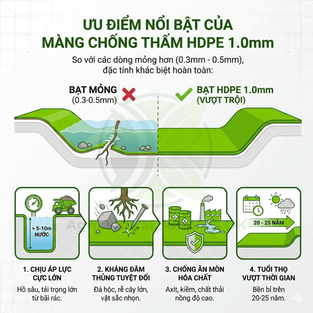 So với các dòng màng mỏng hơn (0.3mm – 0.5mm), bạt HDPE 1mm sở hữu những đặc tính khác biệt hoàn toàn: