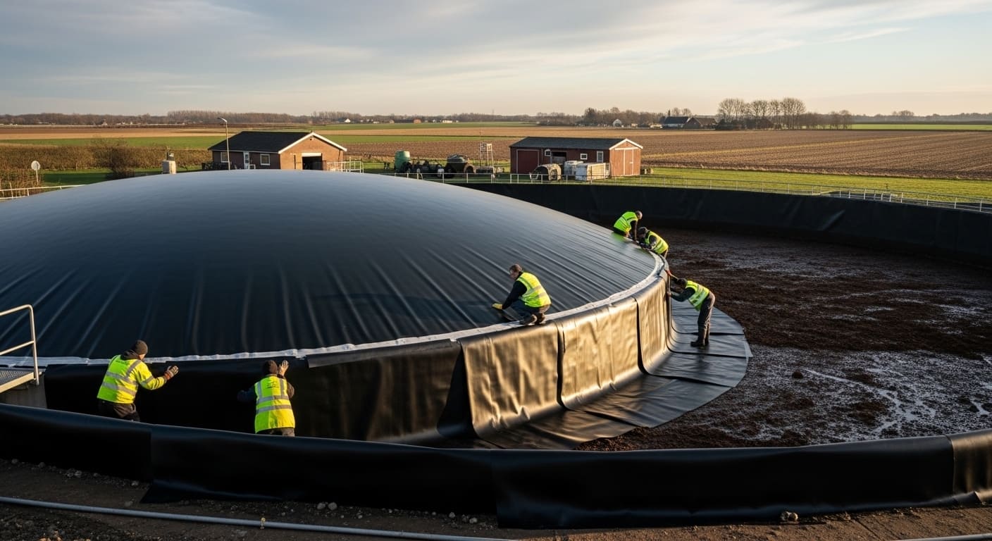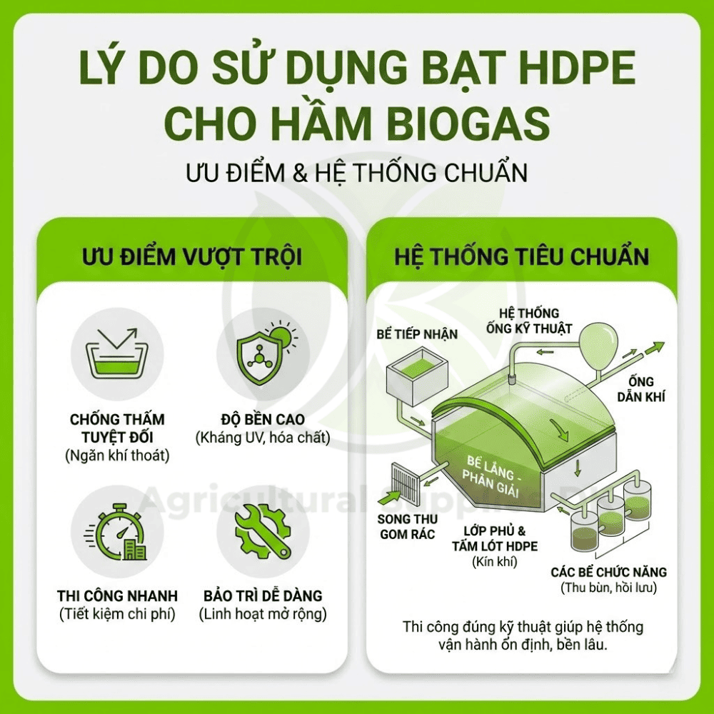 Hầm biogas hiện đại thường sử dụng trải bạt HDPE (Polyethylene mật độ cao) để lót đáy và phủ nổi trên mặt, giúp ngăn chặn khí thoát ra ngoài và bảo vệ môi trường.