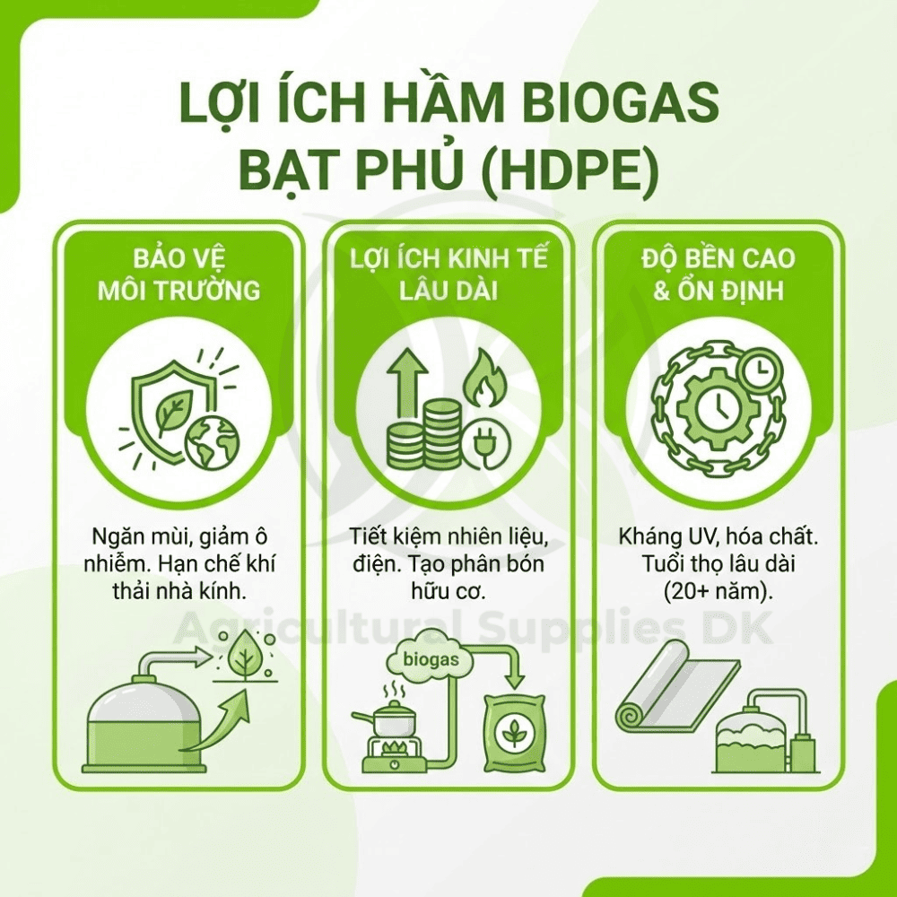 Thi công hầm Biogas bằng tấm phủ HDPE không chỉ là giải pháp xử lý chất thải hiệu quả mà còn mang lại nhiều lợi ích thiết thực cho môi trường, kinh tế và vận hành lâu dài. Dưới đây là những lợi ích nổi bật: