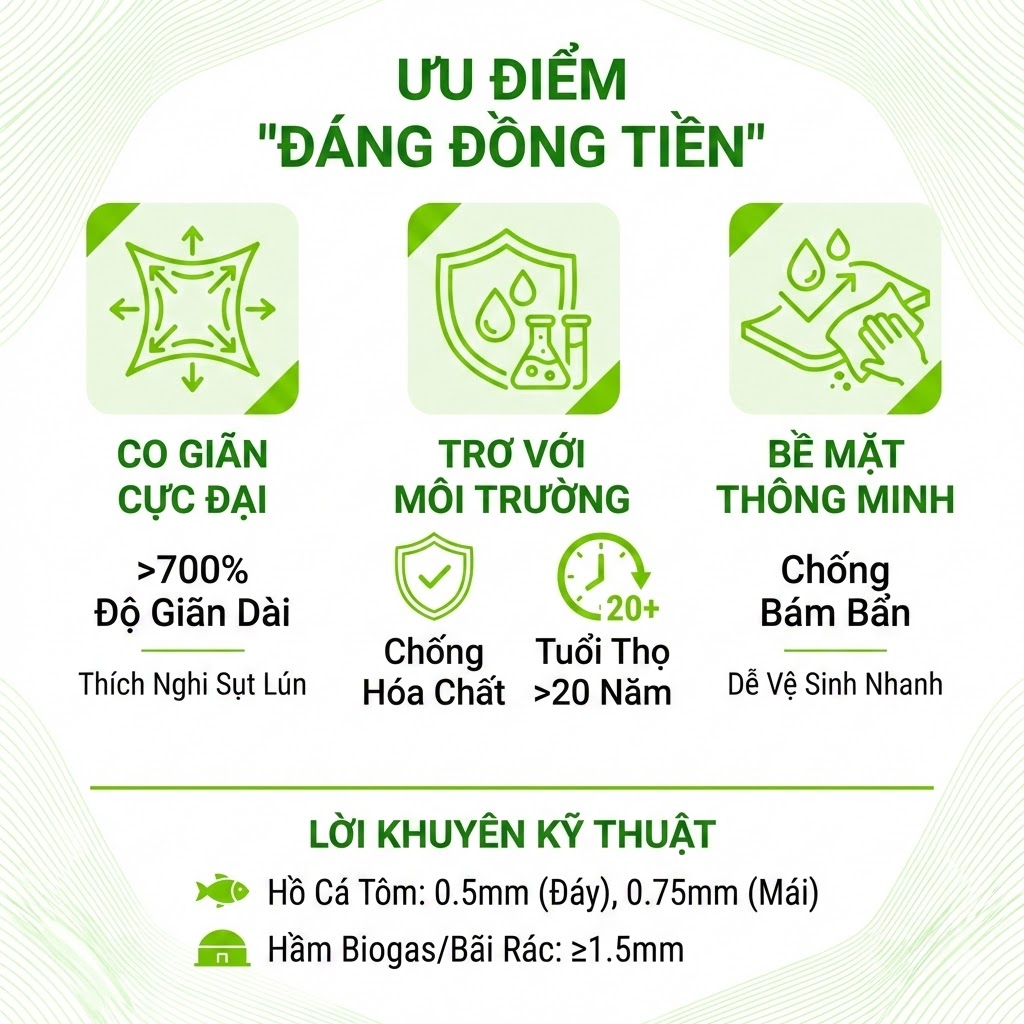 Lời khuyên kỹ thuật: Đối với lót hồ nuôi cá tôm thâm canh, độ dày phổ biến nhất là 0.5mm (cho đáy) và 0.75mm (cho mái taluy). Nếu bạn dùng làm hầm Biogas hoặc bãi rác, hãy ưu tiên loại từ 1.5mm trở lên để đảm bảo an toàn tối đa.
