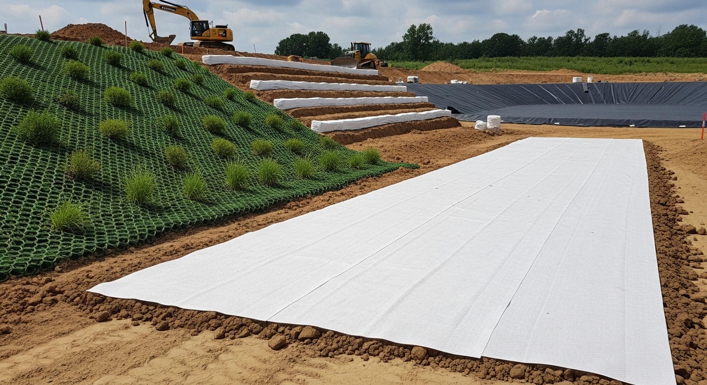 Vải địa kỹ thuật thường được dùng làm lớp lót bảo vệ các màng chống thấm (như màng HDPE) khỏi bị đâm thủng bởi các vật sắc nhọn trong đất đá.