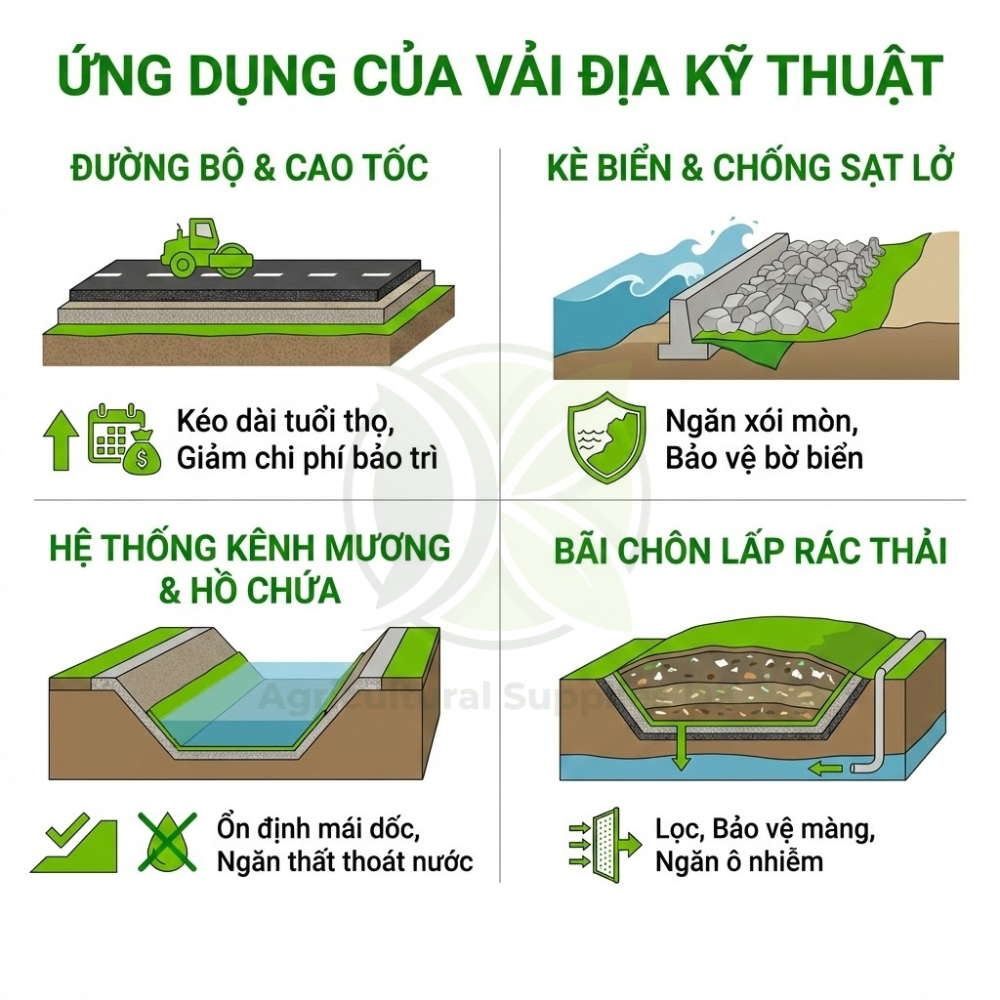 Ứng dụng: Chủ yếu dùng để phân cách các lớp vật liệu và làm lớp lọc trong các công trình thoát nước.
