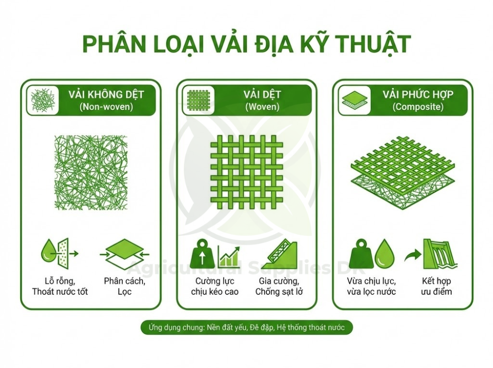 Tùy vào công nghệ sản xuất và mục đích sử dụng, vải địa kỹ thuật được chia thành 3 nhóm chính: